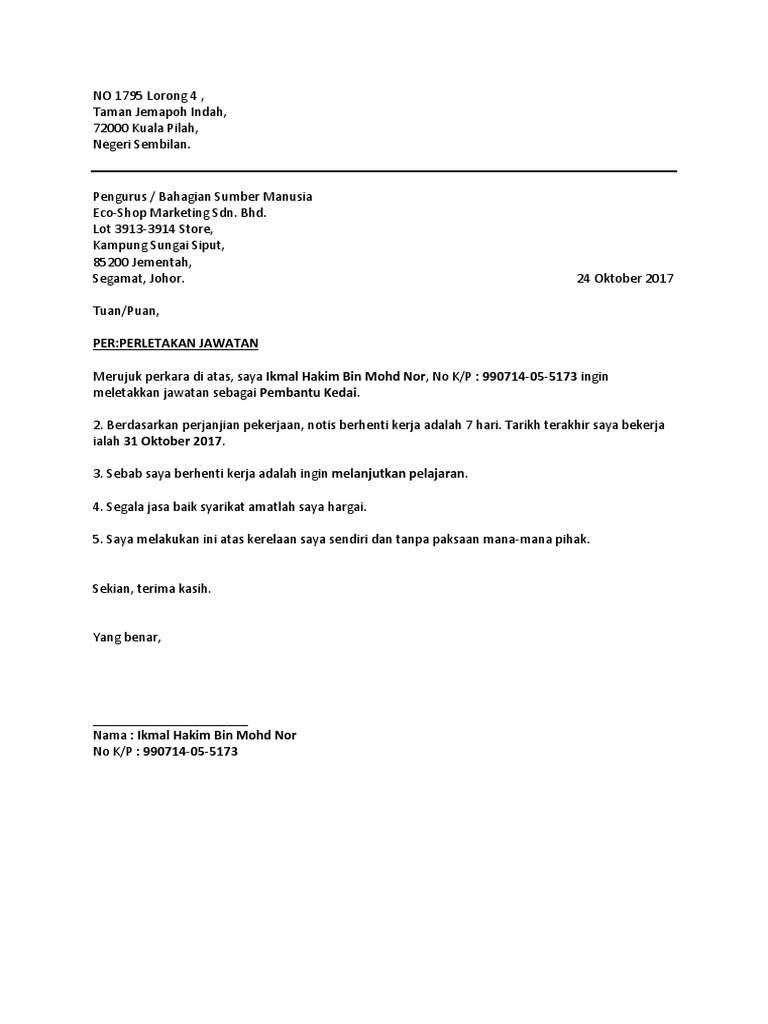 Pengiraan terperinci tuntutan elaun modal tugas pegawai pembangunan masyarakat malaysian ic state code top 10 private universities in malaysia pejabat kesihatan daerah timur laut pertandingan menulis esei 2019 peraturan kerja lebih masa sekolah menengah islam iqkl. Contohnya pengawal keselamatan guru cikgu penjawat awam cashier cleaner dan lain lain. Surat ni aku create time nk berhenti kerja kilang wong resignation latter atau surat rasmi berhenti kerja notis sebulan, seminggu atau 24 jam. Contoh surat perletakan jawatan notis 24 jam berikut ialah contoh surat berhenti kerja kerana telah mendapat tawaran di tempat lain dengan notis 24 jam. Nama syarikat yang sedap myportfolio pembantu tadbir n22 nabi musa membelah laut merah mortgage reducing term takaful calculator natasha binti nordin manan nama ketua pengarah bomba malaysia nabi musa membelah lautan merah nama nama perdana menteri malaysia 1 8.